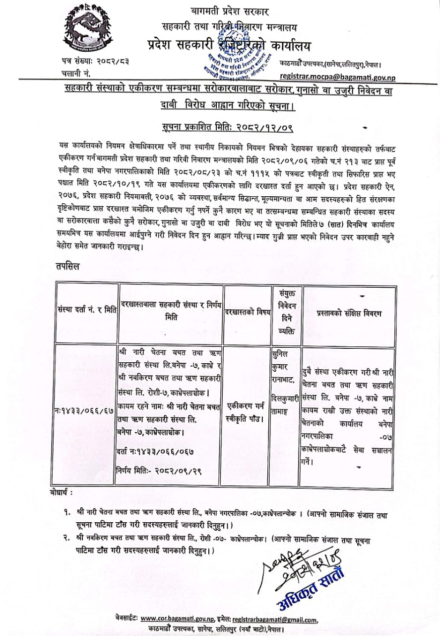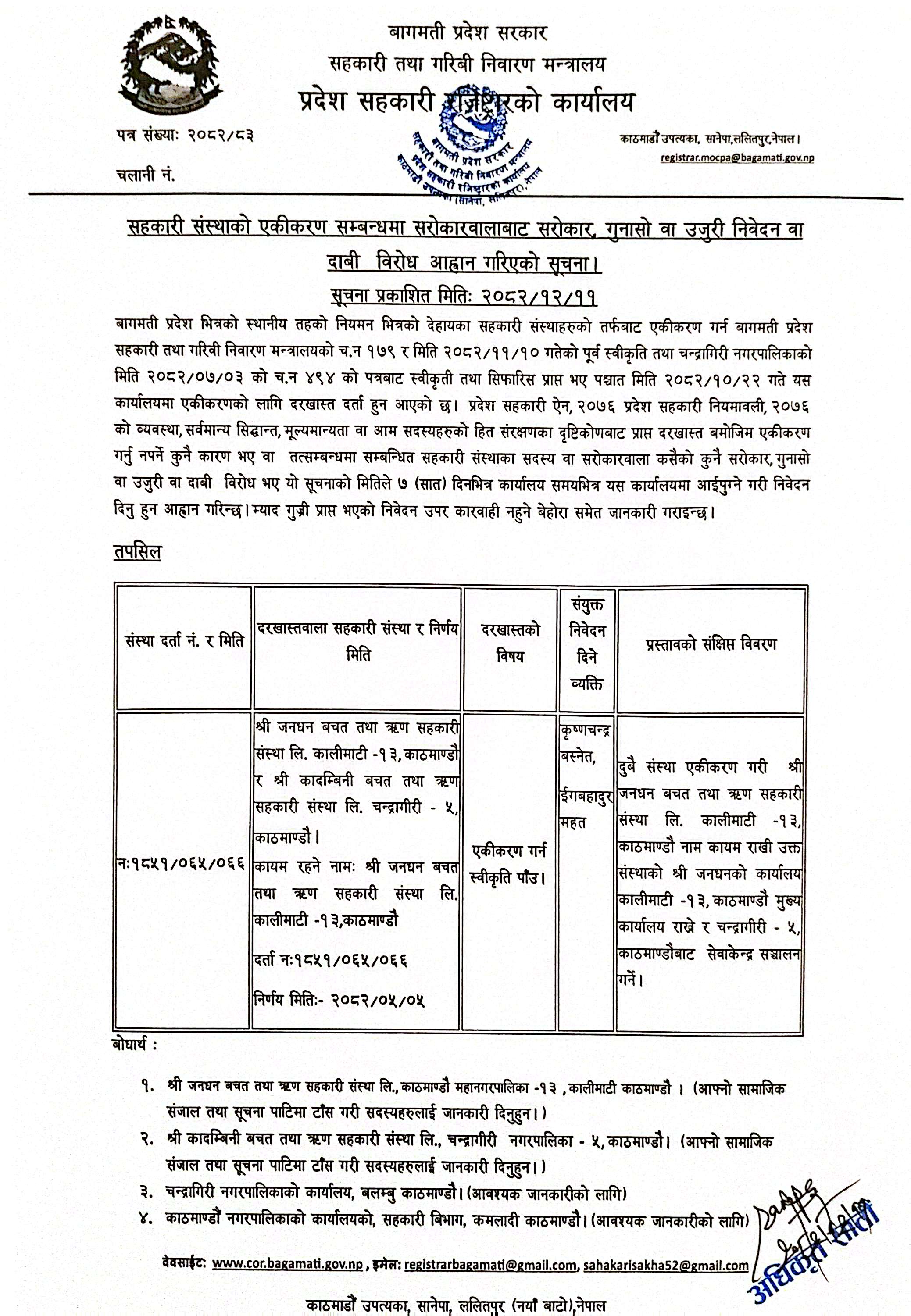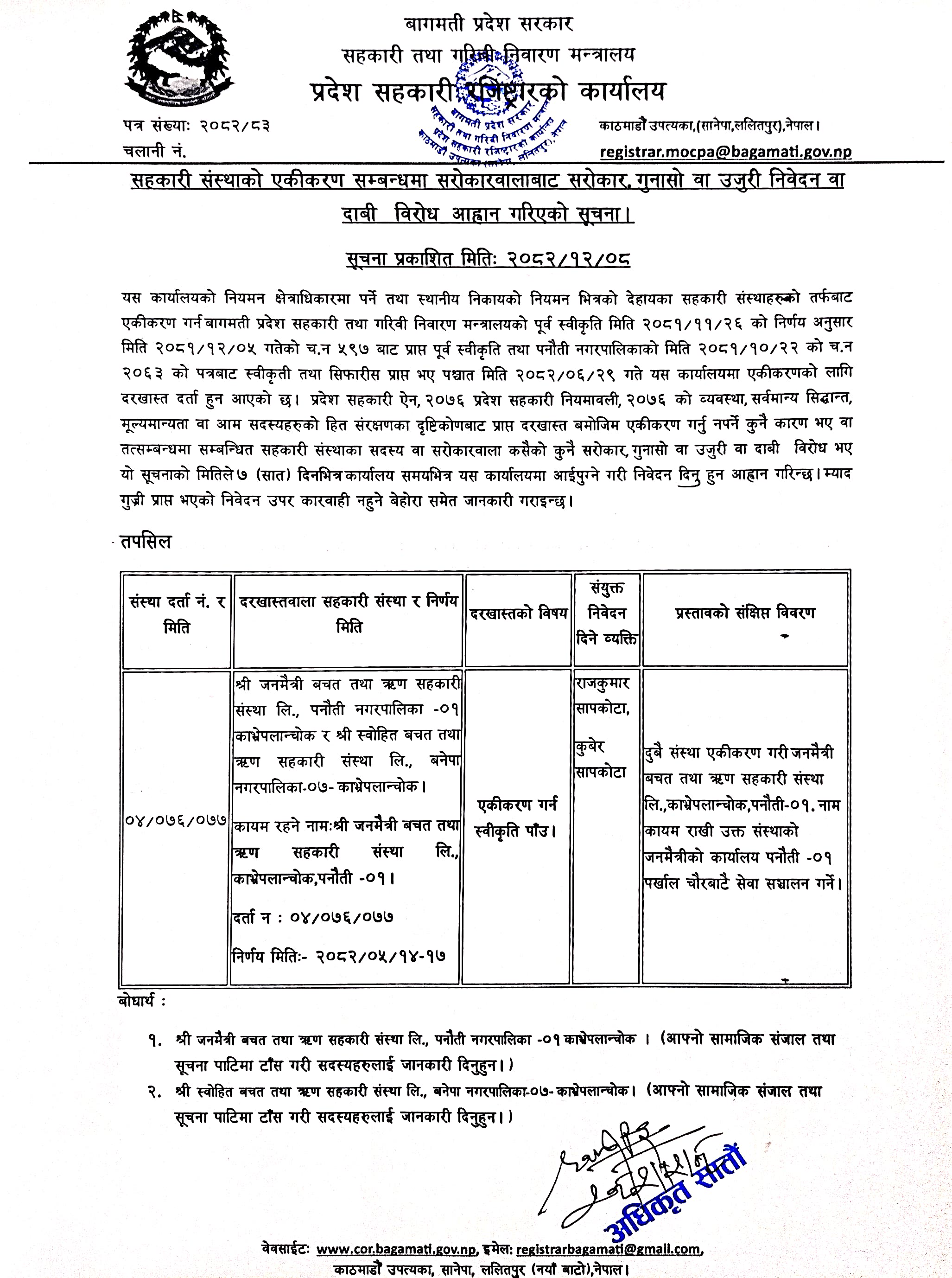 सहकारी संस्थाको एकीकरण सम्बन्धमा सरोकारवालाहरुबाट सरोकार, गुनासो वा उजुरी निवेदन वा दाबी विरोध आह्वान गरिएको सूचना। प्रकाशित मिति 2082/12/17 |