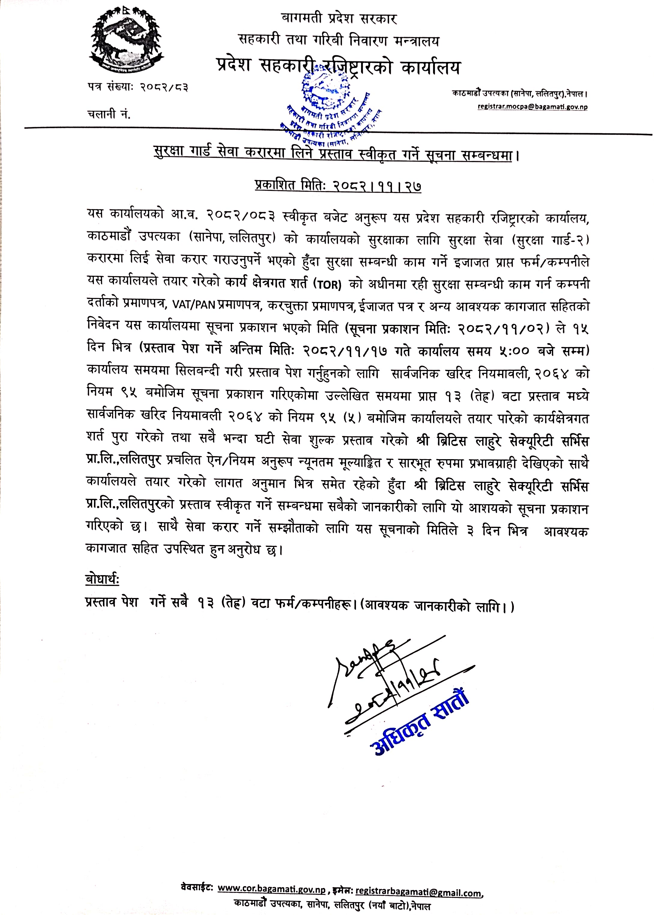 सुरक्षा गार्ड सेवा करारमा लिने प्रस्ताव स्वीकृत गर्ने सूचना सम्बन्धमा। |