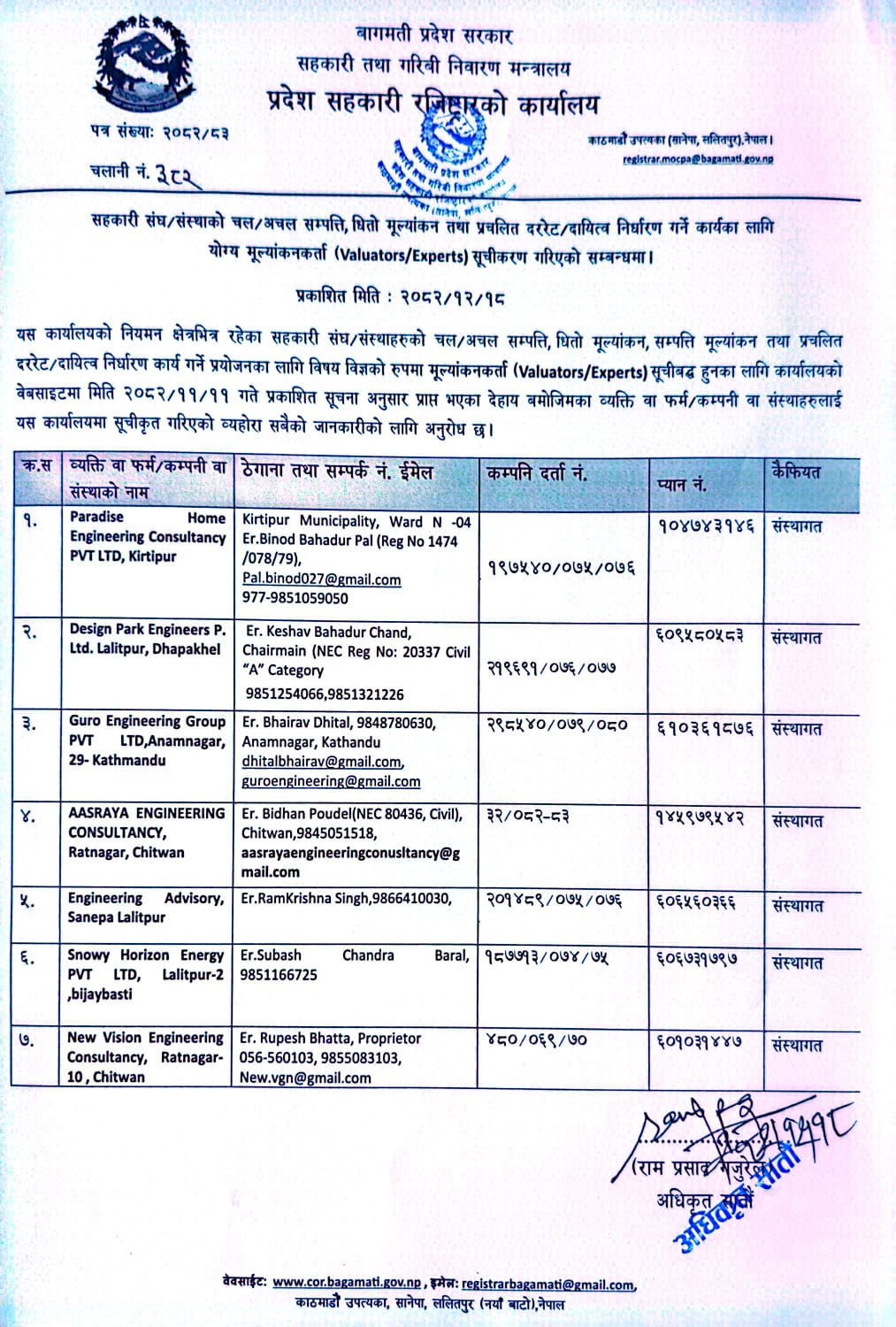 सहकारी संघ/संस्थाको धितो मूल्यांकन गर्ने कार्यका लागि (Valuators/Experts) सूचीकरण गरिएको सम्बन्धमा । २०८२-१२-१८ |