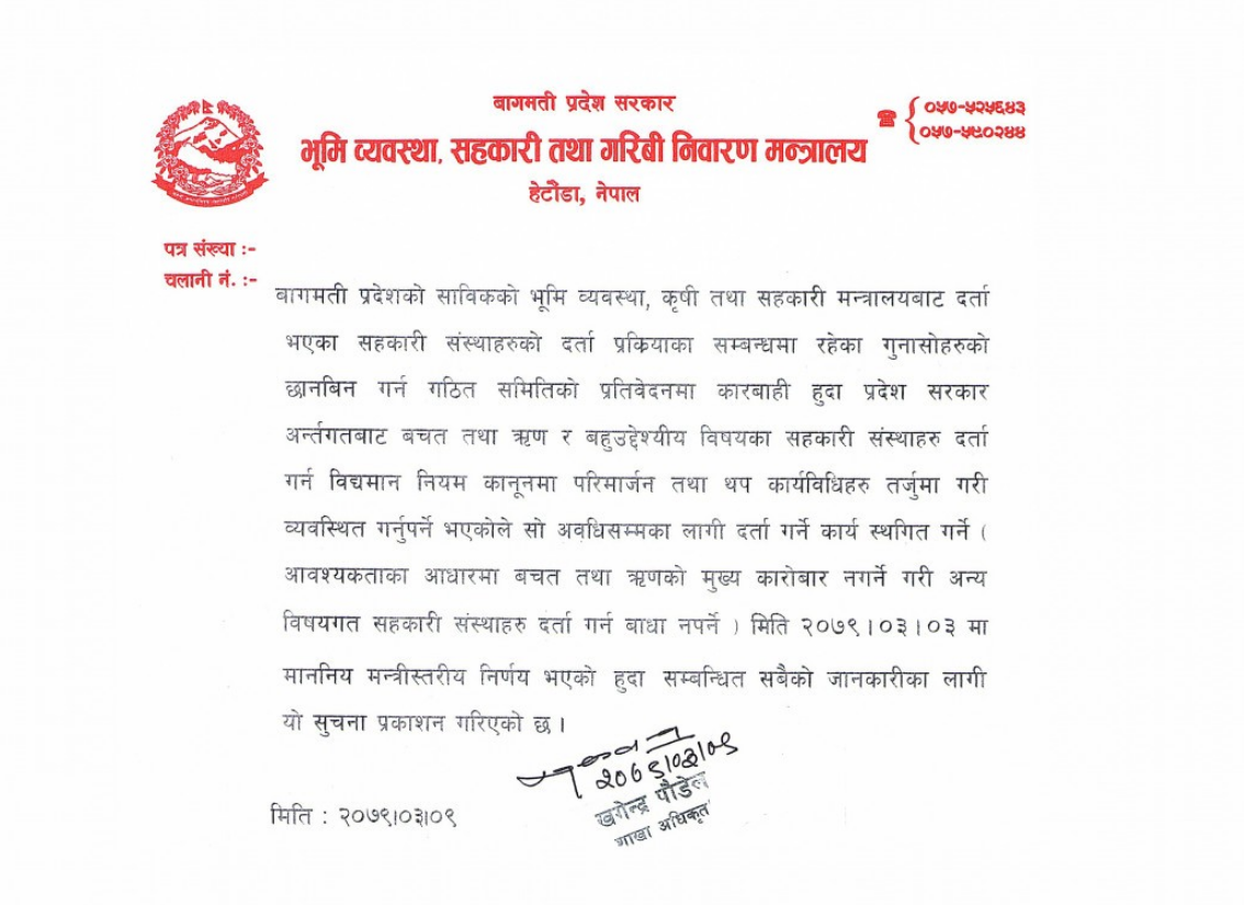 1 मिति २०७९/०३/०९ को सहकारी संघ संस्था सम्बन्धी दर्ता रोक्का बिषयको सूचना चैत २१, २०८२, शनिबार २१:३८